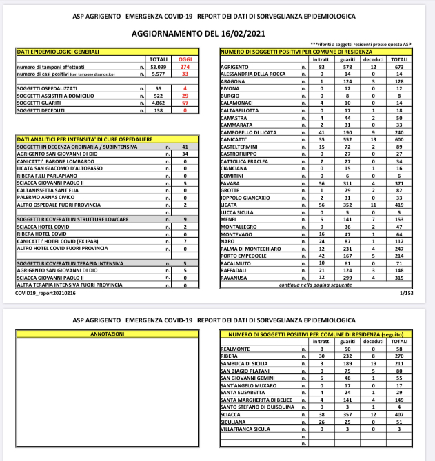 Sono 33 i nuovi casi di coronavirus registrati in provincia di Agrigento nelle ultime ventiquattro ore. Il dato emerge dal bollettino diffuso dall'Asp sull'andamento epidemiologico nell'agrigentino del 16 febbraio. Si registrano 4 ricoveri, 57 guariti e nessun decesso. I tamponi effettuati sono stati 274 che portano il totale dei test processati a 53.099. Ventinove le persone assistite a domicilio.